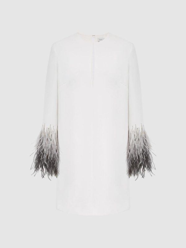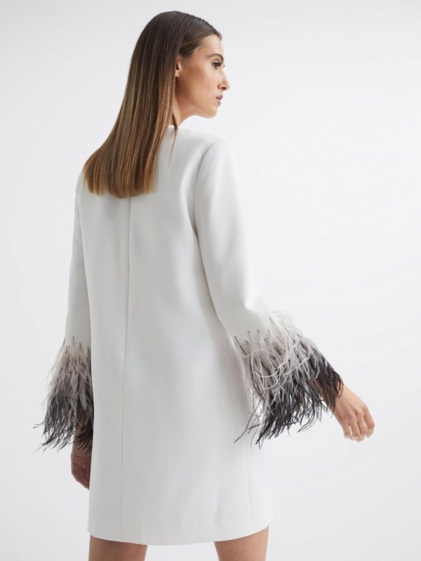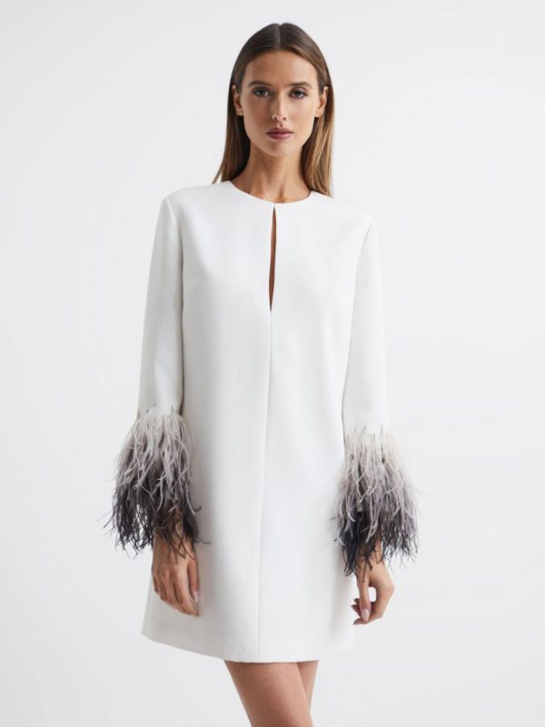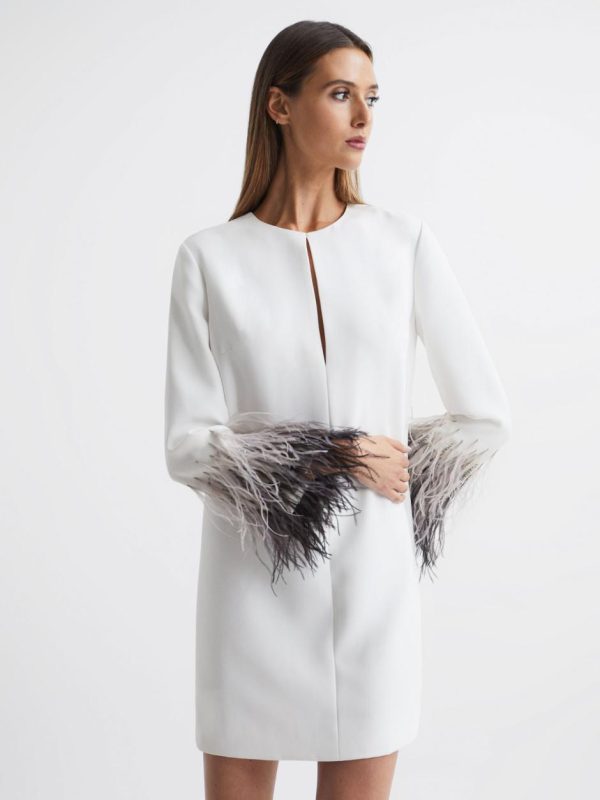 Meet your new go-to cocktail dress – the stunning Kendall gown. Designed with a flattering round neckline and chic above-the-knee length, this dress features an elegant keyhole opening at the chest for subtle allure. The sleeves create a show-stopping effect with luxurious feather and sequin detailing that catches the light beautifully. Complete your celebration look with classic black stilettos for unforgettable style.