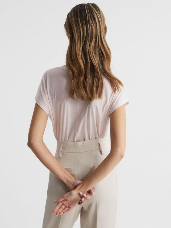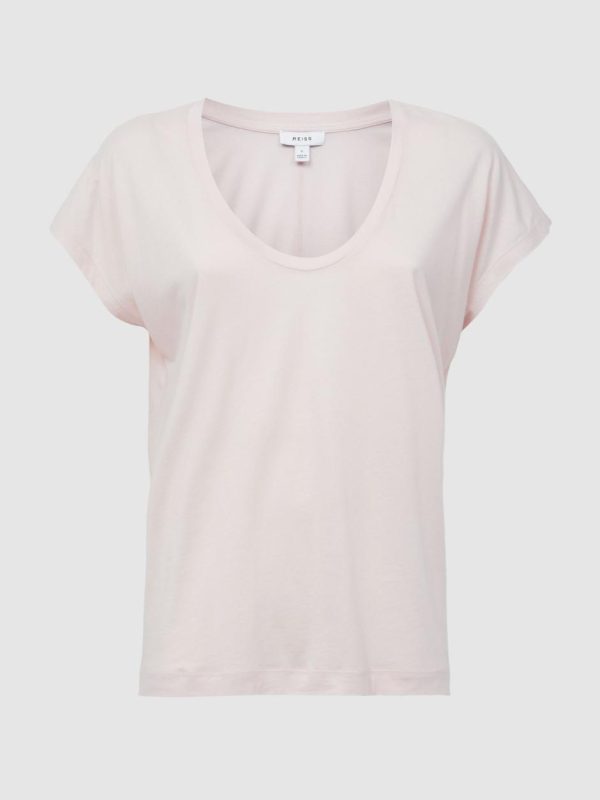 The Caia T-shirt in light pink is a wardrobe staple that matches with an array of outfits. It s crafted with a deep scoop neckline and short sleeves. This style is cut from a Pima cotton and lyocell blend, meaning it s a soft and durable style for all seasons. Style it with our relaxed trousers and leather trainers for an understated-yet-chic casual ensemble.
